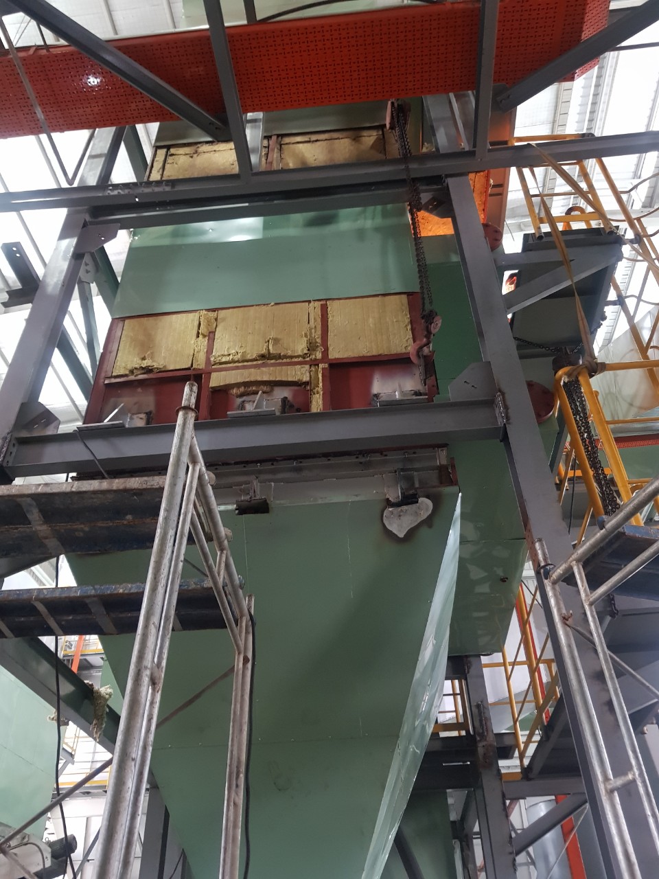 - Buồng đốt - thân lò: Được thiết kế để đốt triệt để nhiên liệu và hấp thu nhiệt tốt nhất cho quá trình sinh hơi. Bao gồm các thiết bị như: Ghi xích, buồng đốt, quạt gió cấp 1, quạt gió cấp 2, giàn ống hấp thụ nhiệt bức xạ, giàn ống sinh hơi đối lưu.